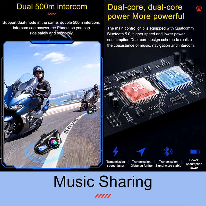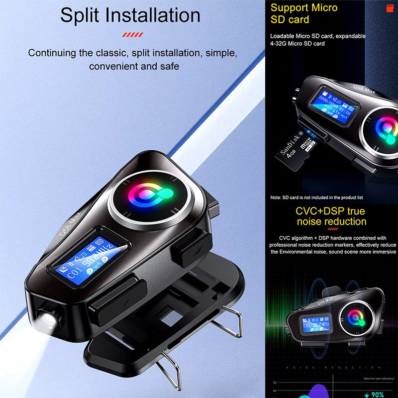• Procesamiento de audio avanzado: El INTERCOM BT Q58 presenta capacidades de procesamiento de múltiples capas dual DSP para mezclar sonidos de diferentes escenas. Ya sea que se esté comunicando, navegando o haciendo una llamada, puede disfrutar de un audio claro e inmersivo.