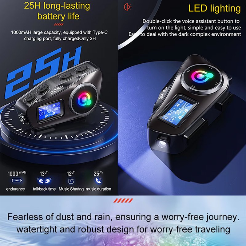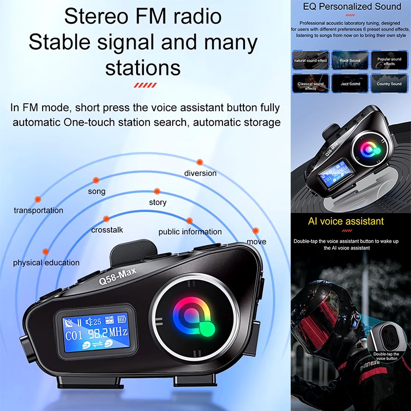 • Conectividad Bluetooth: Experimente una comunicación perfecta con el intercomunicador Bluetooth Q58-MAX para casco de motocicleta, lo que garantiza conversaciones claras e ininterrumpidas de hasta 500m de distancia.